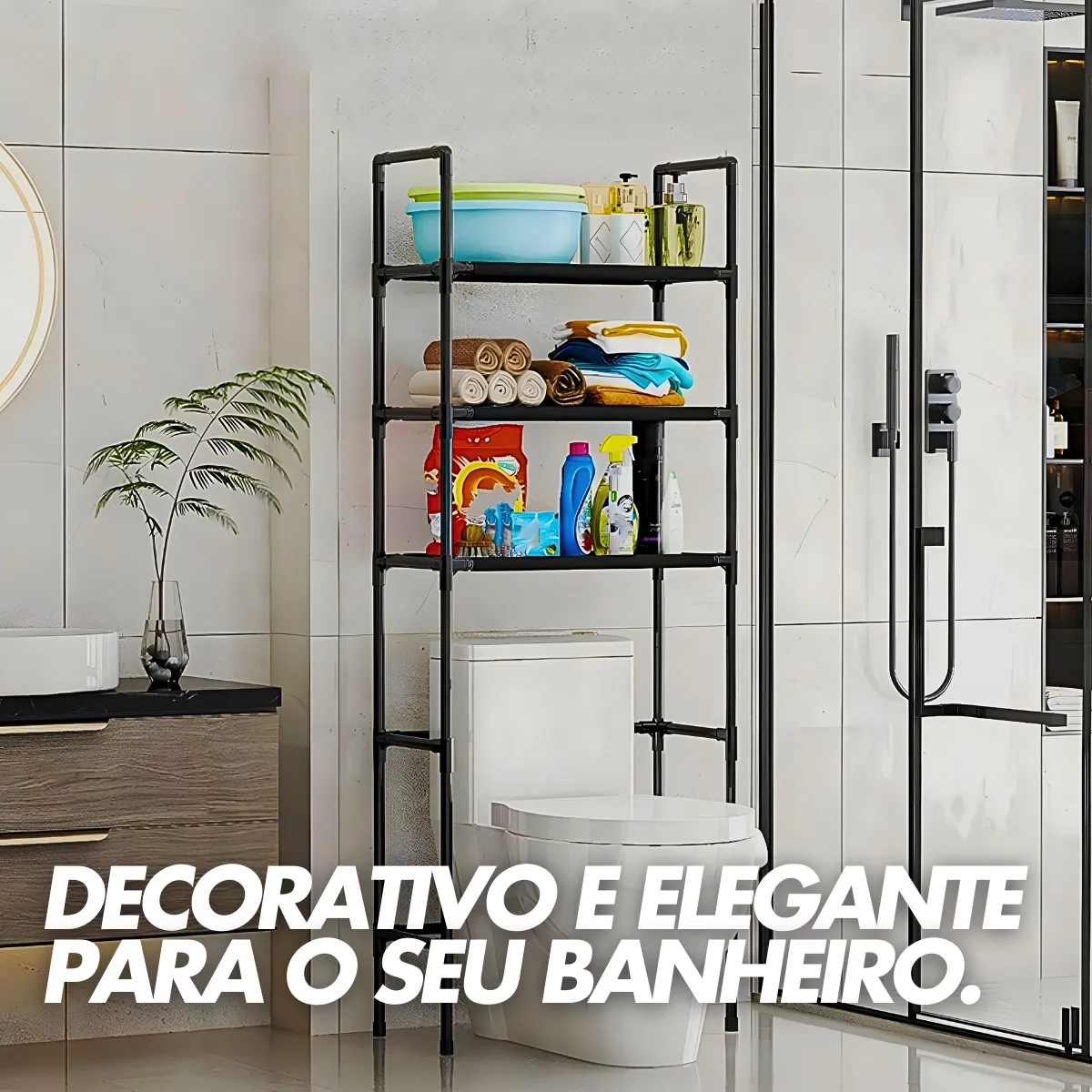 Transforme seu banheiro com a Prateleira Organizadora Multiuso sobre Vaso com 3 Prateleiras, uma solução inteligente para maximizar cada canto do ambiente. Projetada para combinar funcionalidade e estilo, esta prateleira ajustável oferece espaço generoso para armazenar uma variedade de itens essenciais, desde toalhas até produtos de higiene pessoal.
